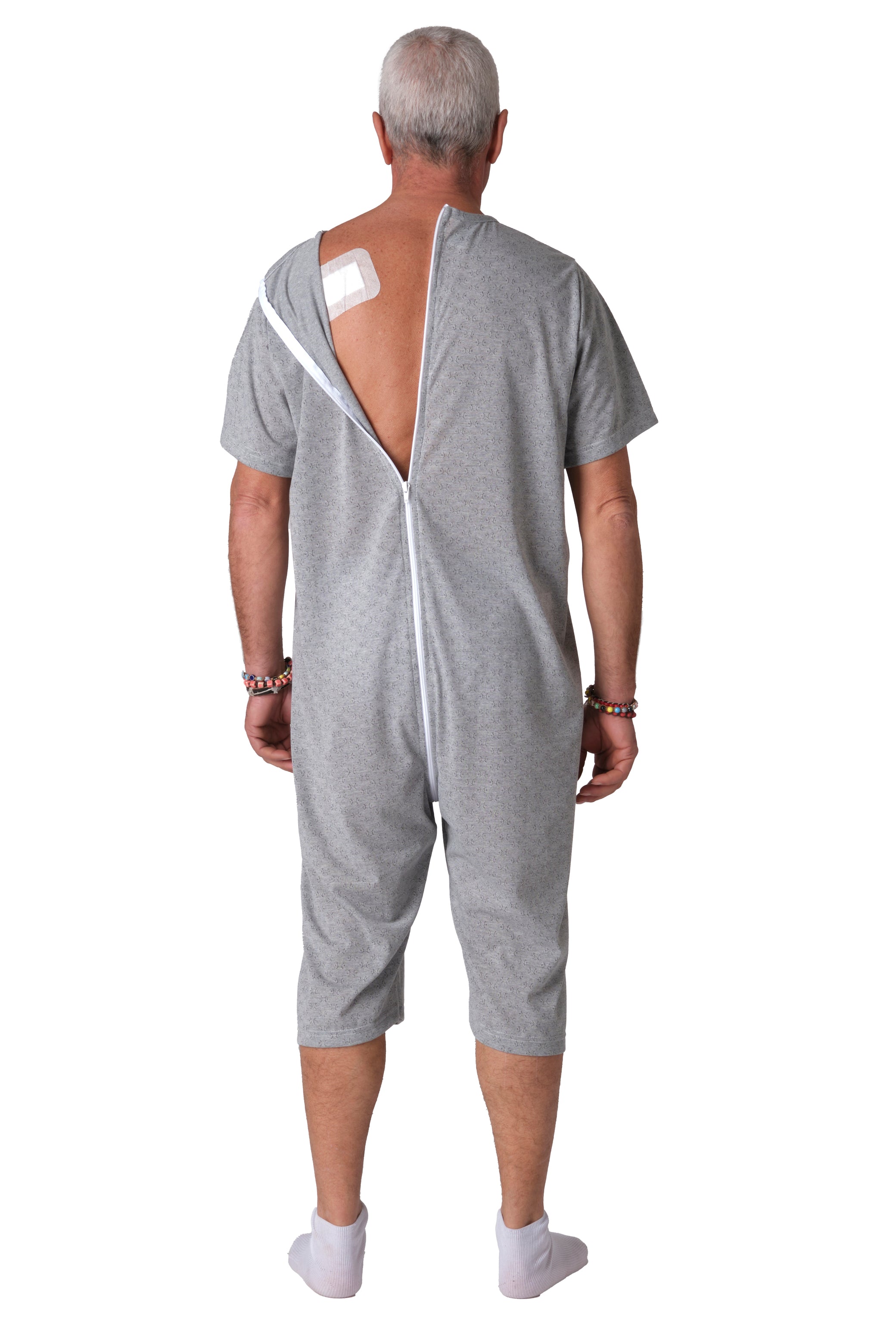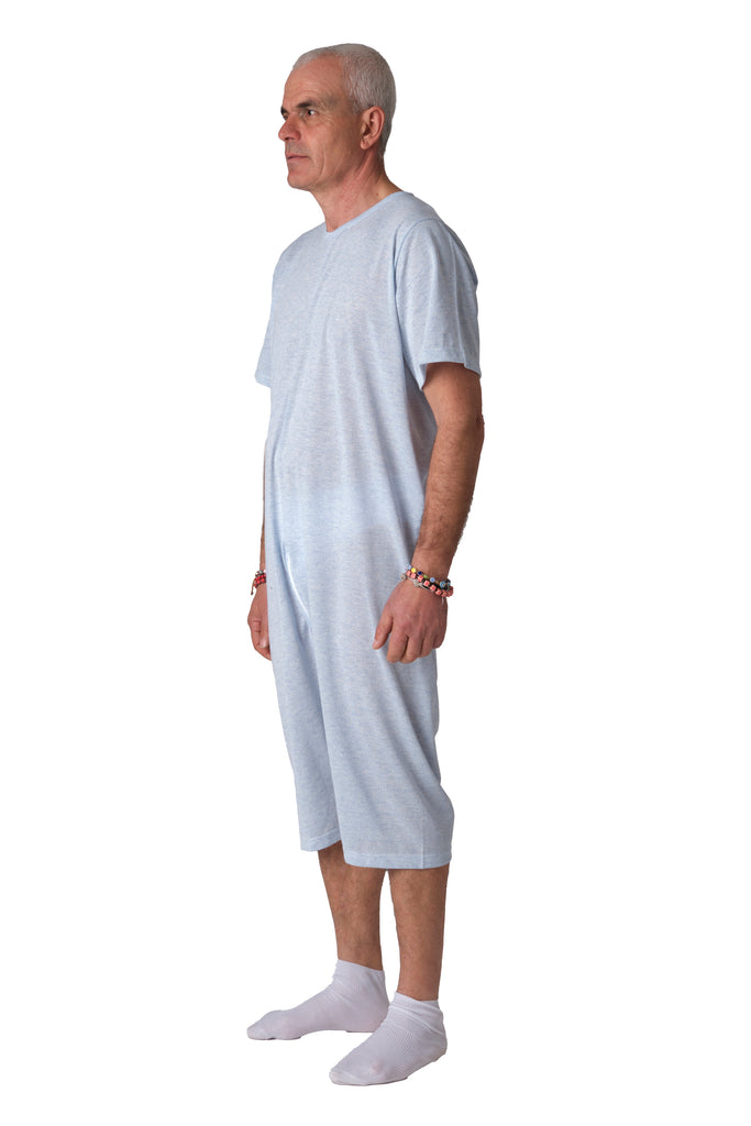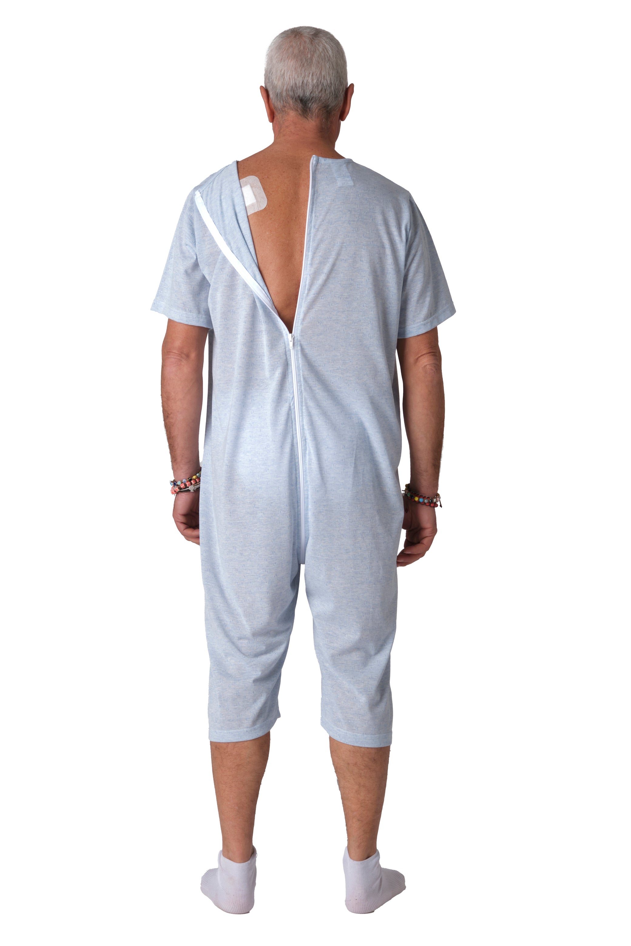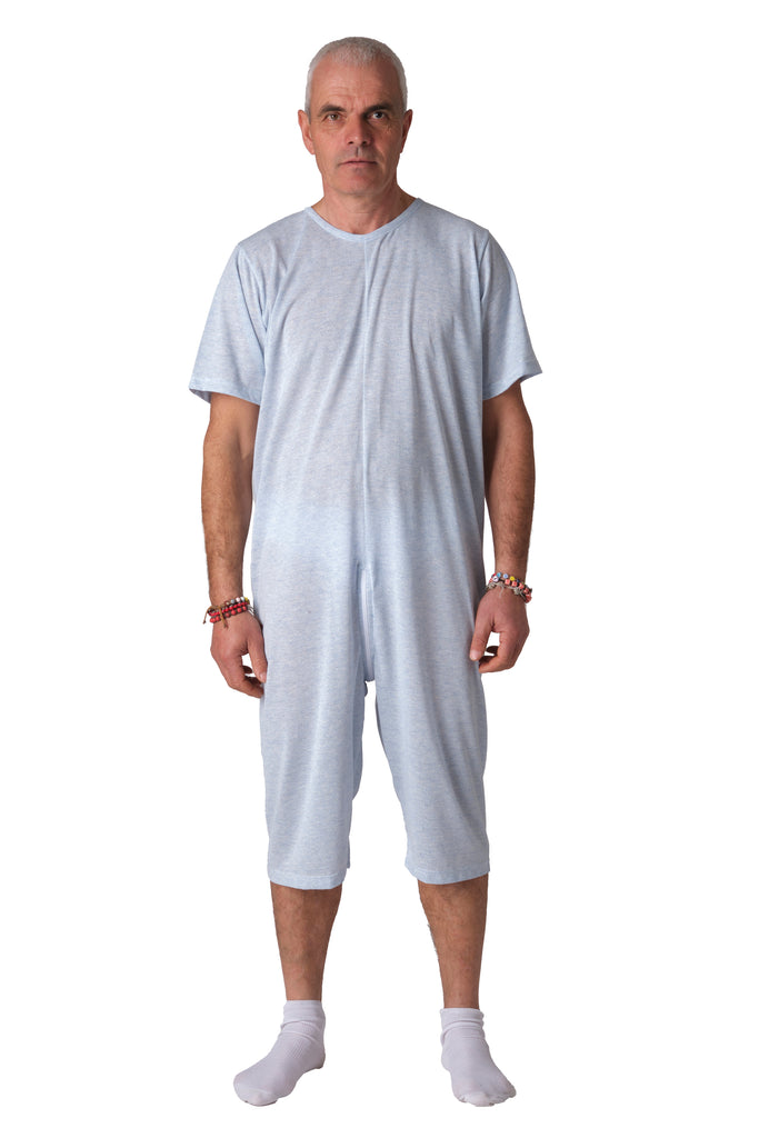 Grazie alla cerniera unica posteriore che si estende fino al punto vita, il pigiama facilita il lavoro degli operatori sanitari durante il cambio degli ausili e impedisce al paziente di rimuovere accidentalmente il capo. Versione manica corta e pantalone corto.