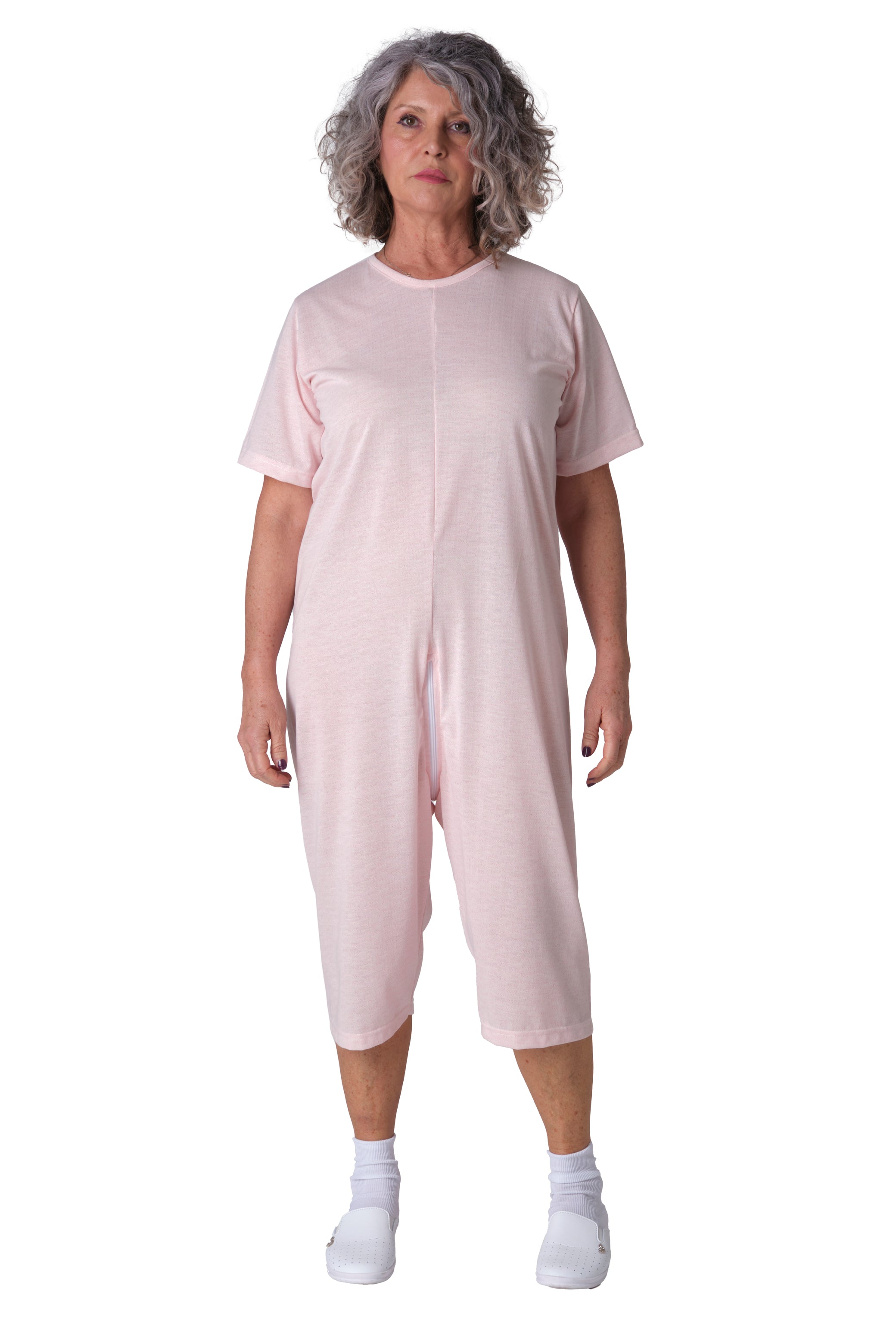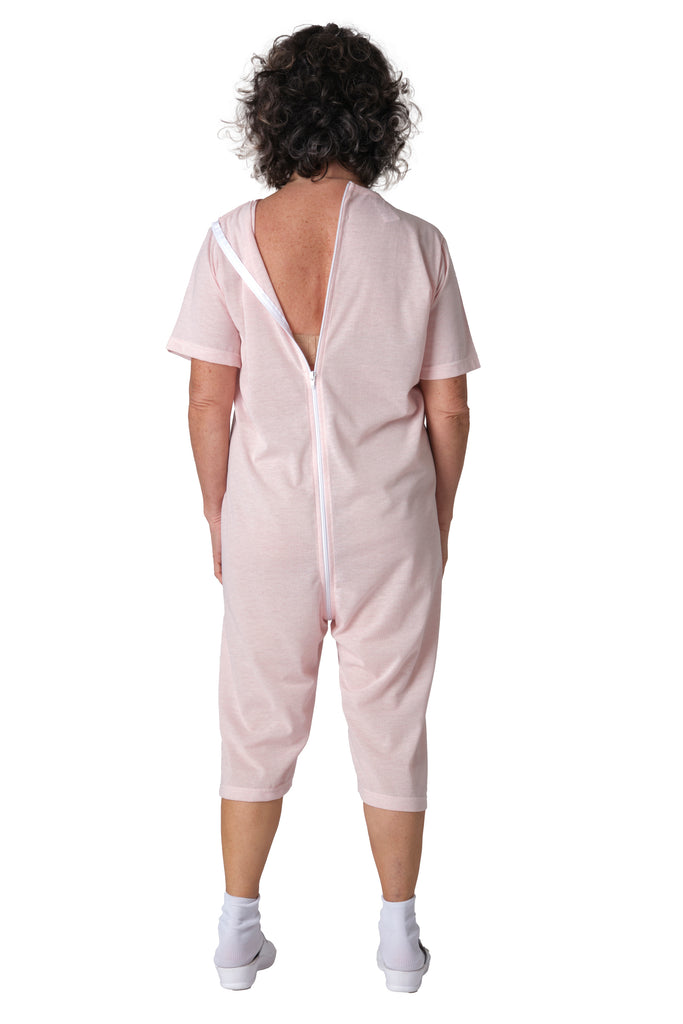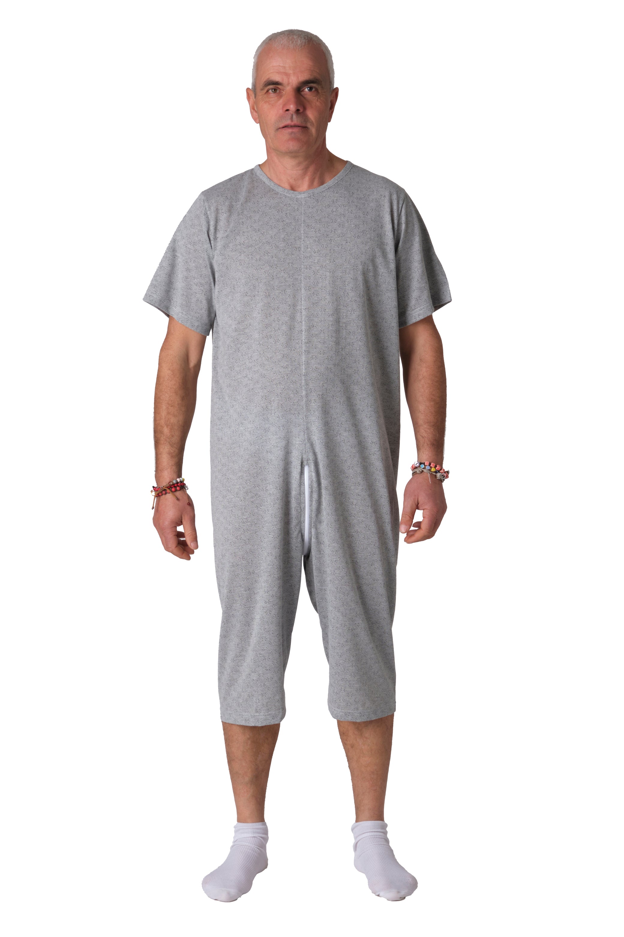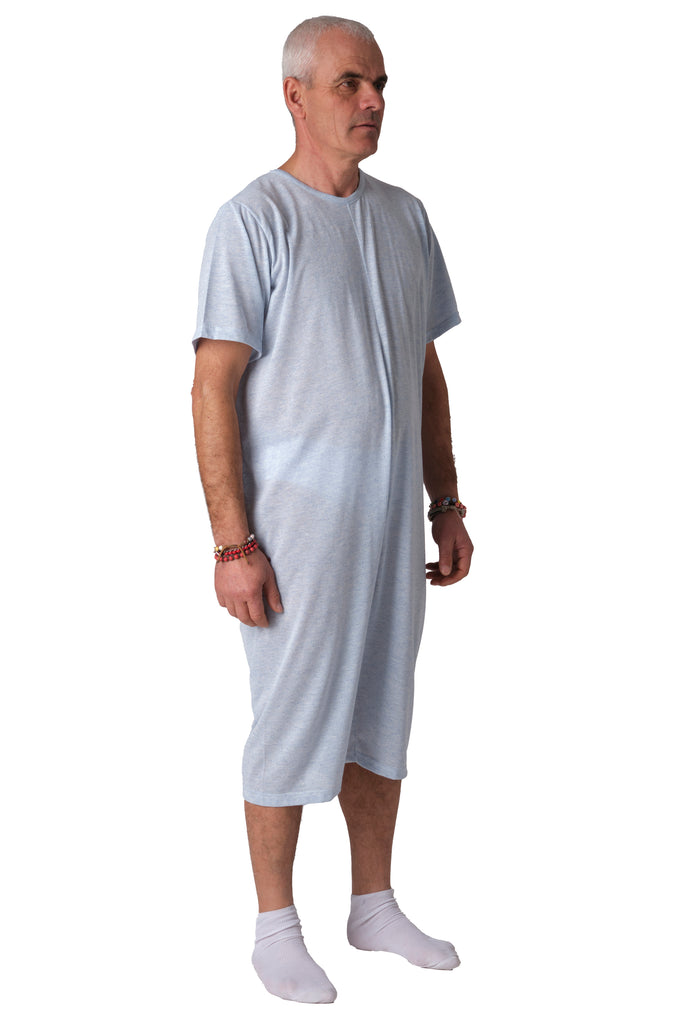 Grazie alla cerniera unica posteriore che si estende fino al punto vita, il pigiama facilita il lavoro degli operatori sanitari durante il cambio degli ausili e impedisce al paziente di rimuovere accidentalmente il capo. Versione manica corta e pantalone corto.