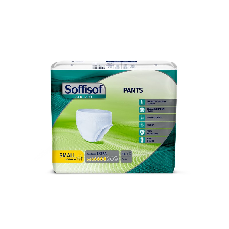 Soffisof Air Dry Pants Extra è una mutandina assorbente monouso ideale per pazienti deambulanti, autosufficienti e attivi, con perdite medie. Facile da indossare come la normale biancheria intima. Discreta, confortevole e silenziosa.