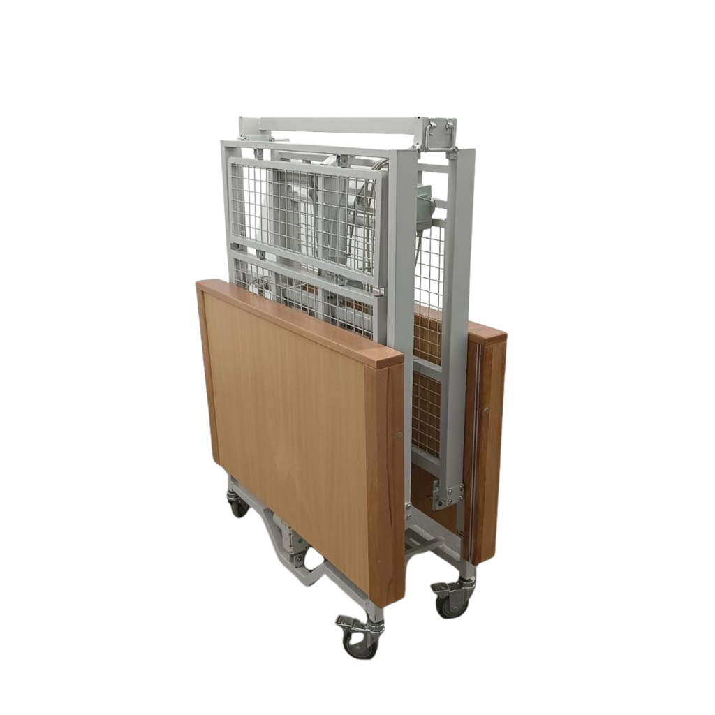 Sicurezza e igiene Il piano rete è progettato per ridurre la pressione e prevenire le piaghe da decubito, con una struttura a rete che favorisce la traspirazione. Le sponde laterali in legno massello a 4 sezioni offrono protezione totale anticaduta, mentre il sistema frenante indipendente sulle 4 ruote garantisce stabilità assoluta.