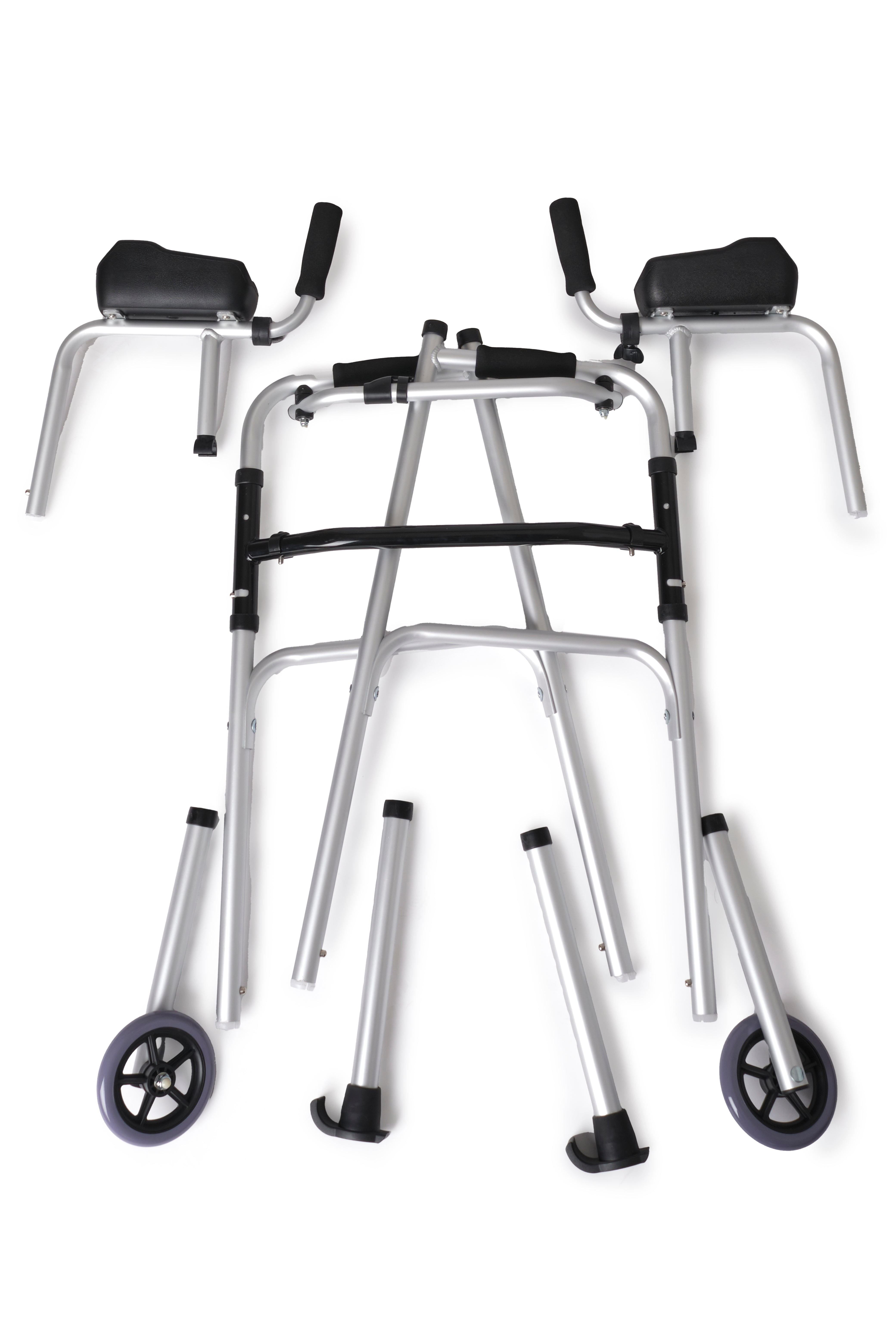 • Folding walker made of aluminum, highly resistant to bad weather and usable on any type of ground. Equipped with 2 front wheels and forearm support. Adjustable in height on 8 levels. Also adjustable in forearm length. Max load 100 KG.