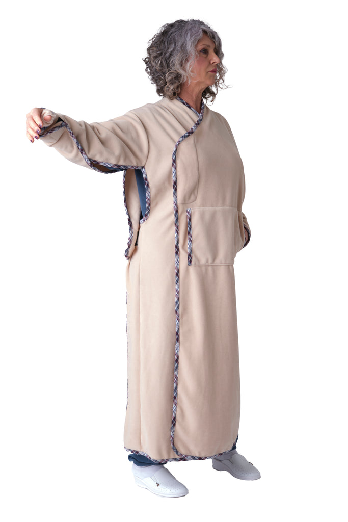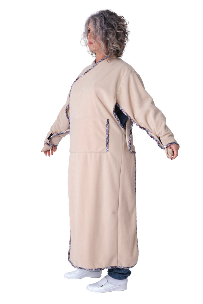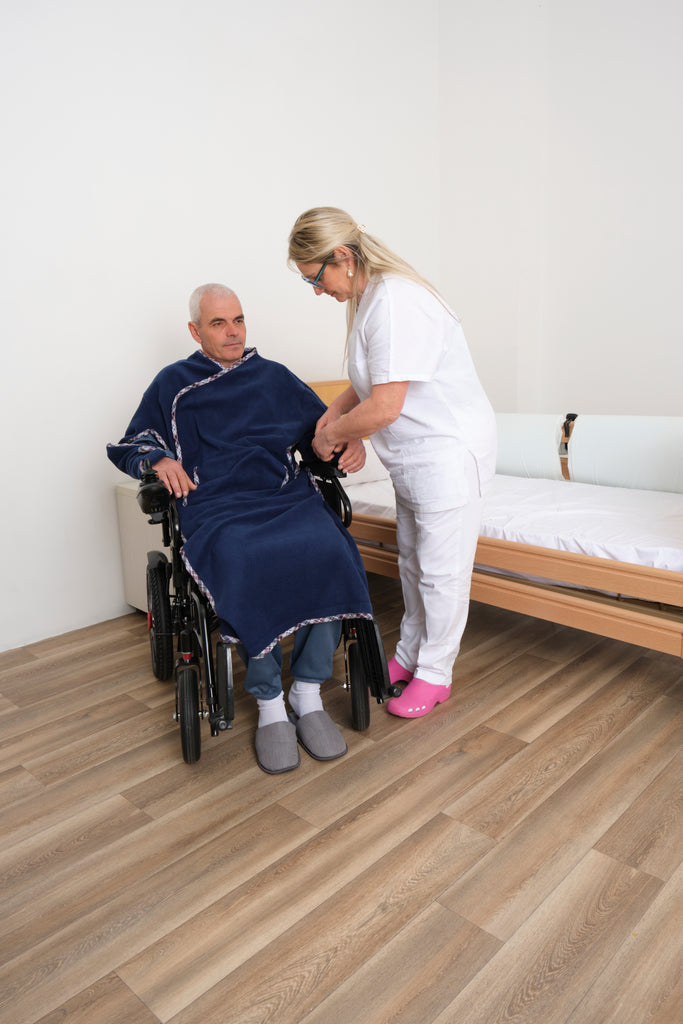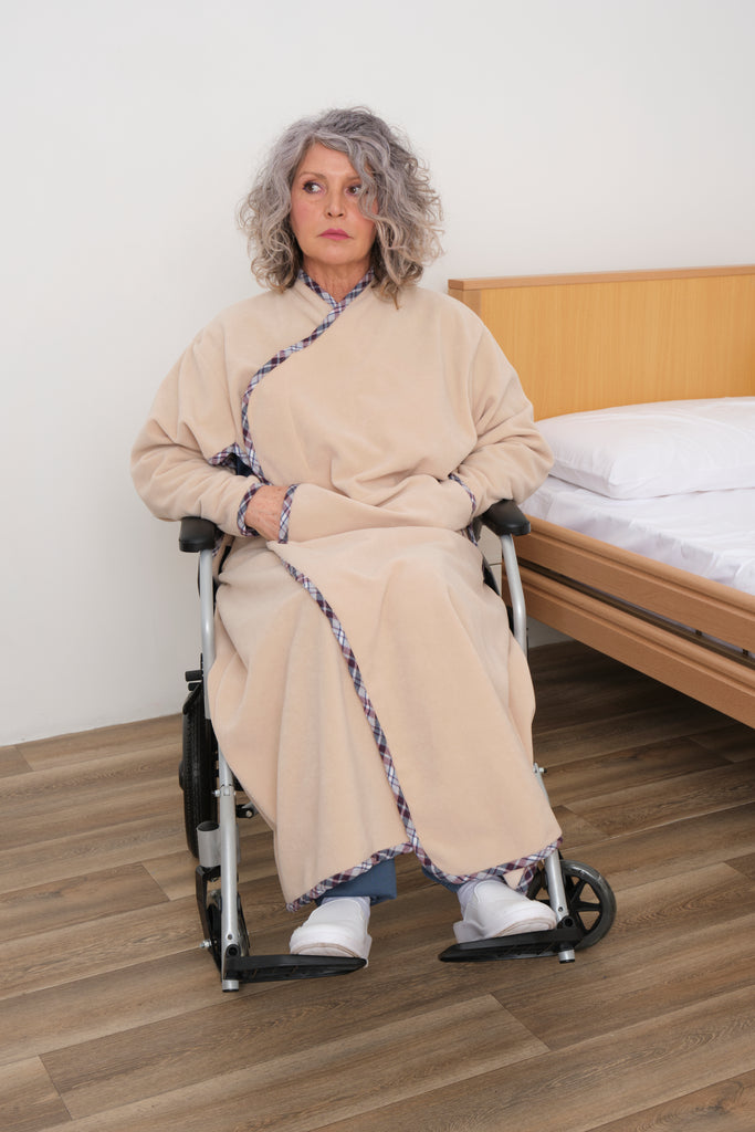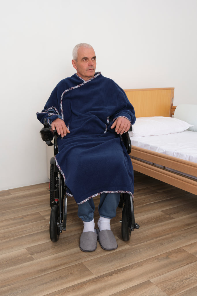 Grazie alle aperture laterali con chiusura in velcro la coperta è estremamente facile da indossare e da togliere: una soluzione ideale sia per chi la utilizza in autonomia, sia per i caregiver e assistenti che devono agevolare la vestizione. Facile da indossare anche stando comodamente seduti.
