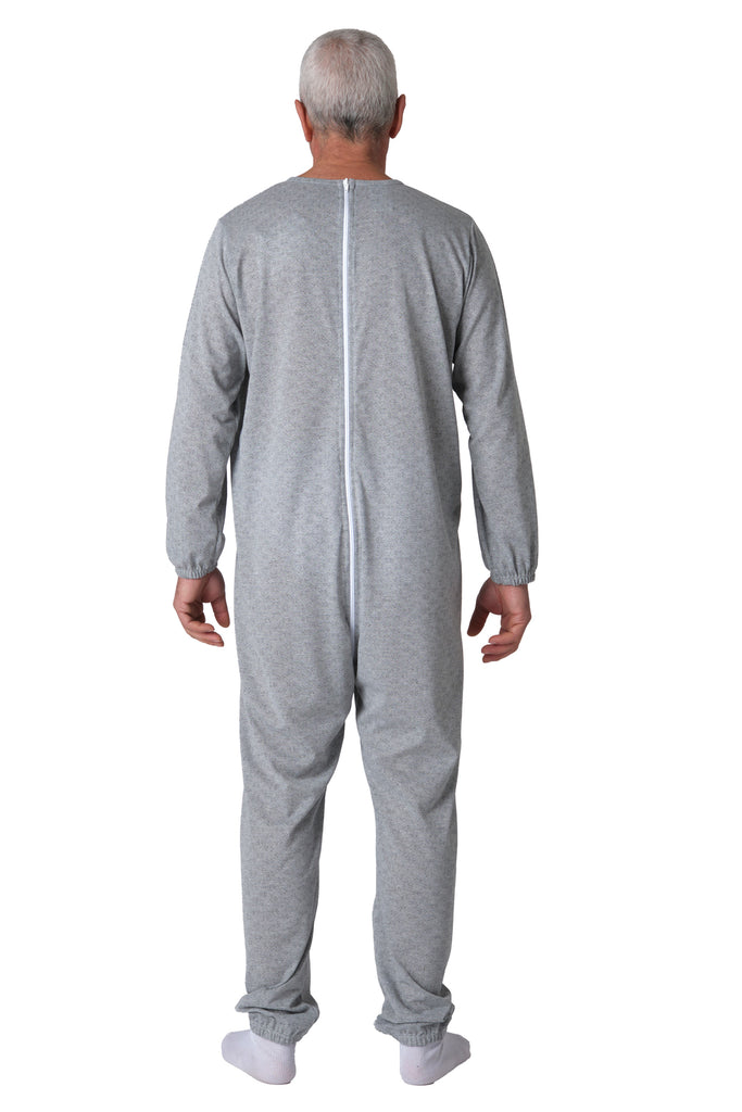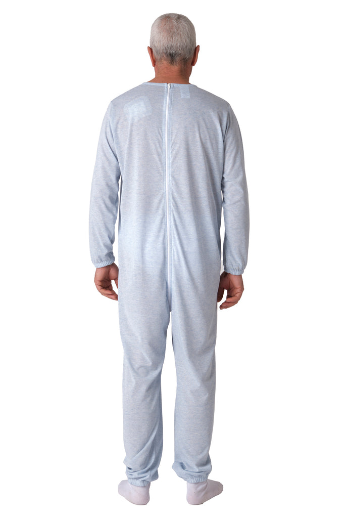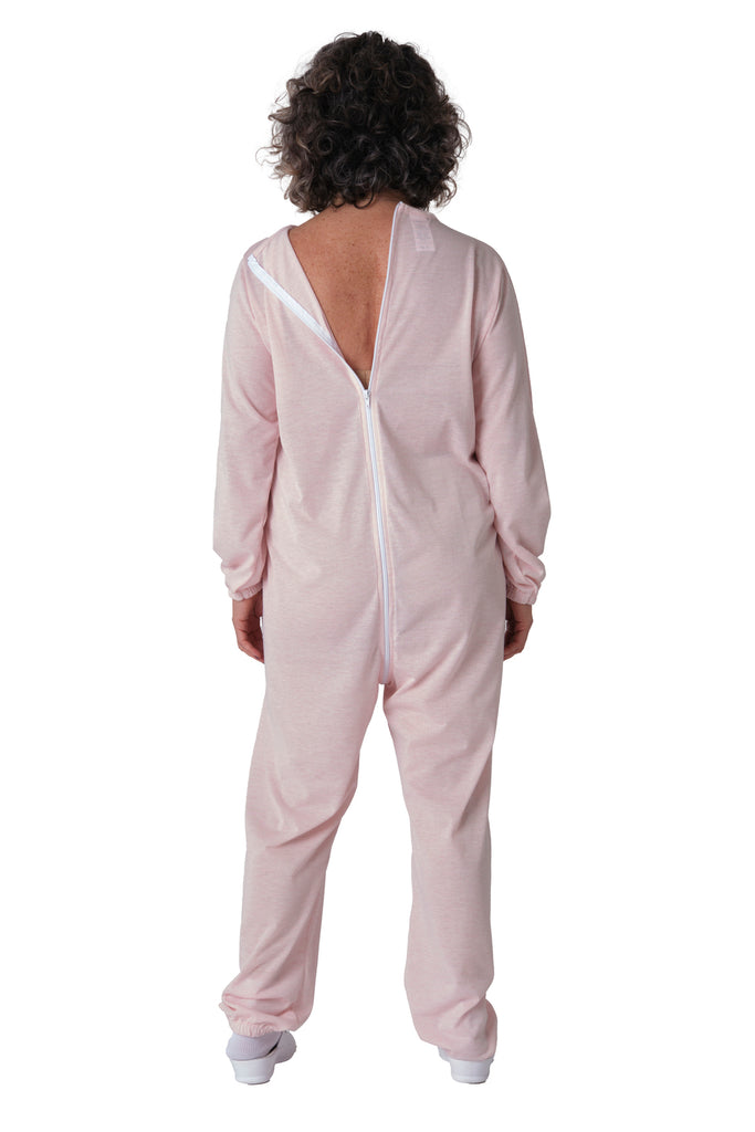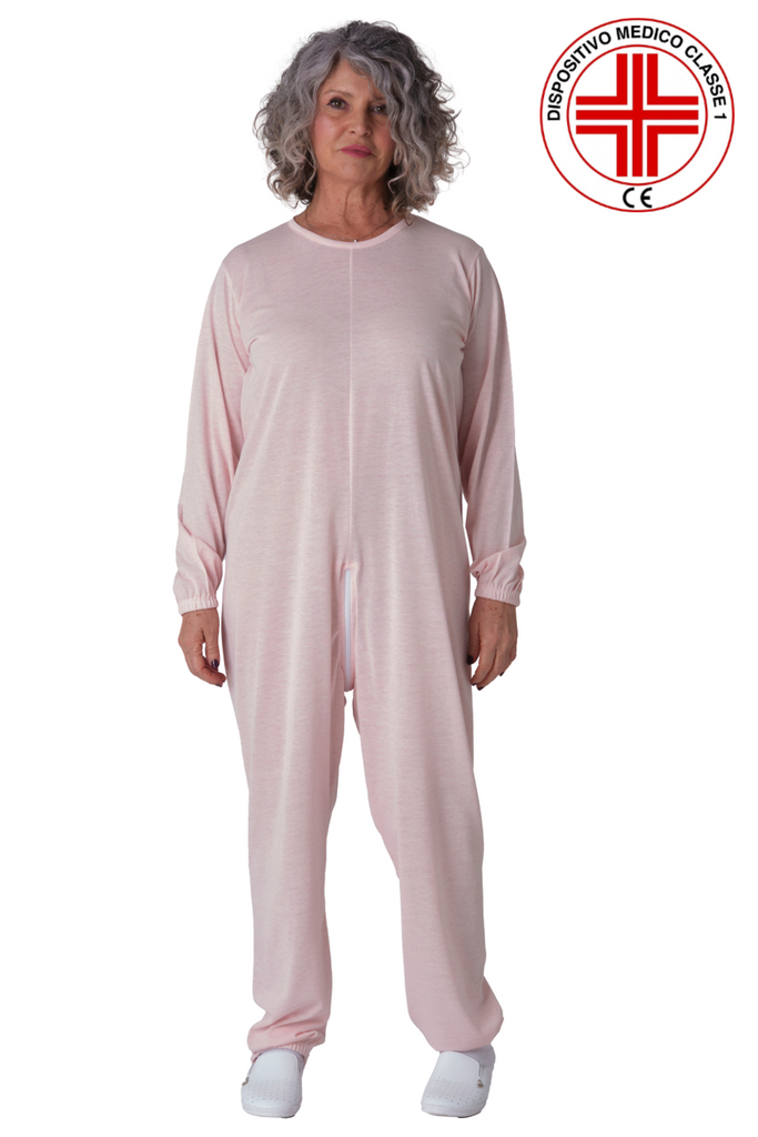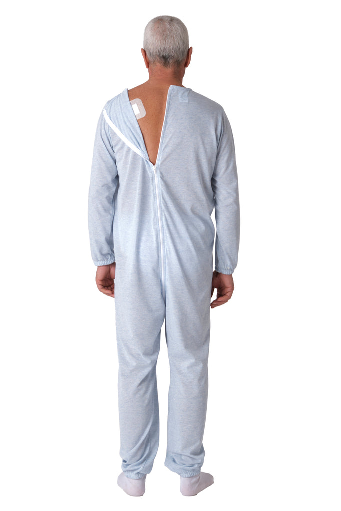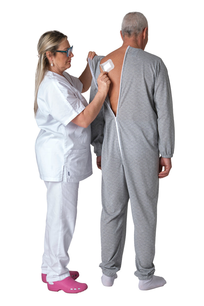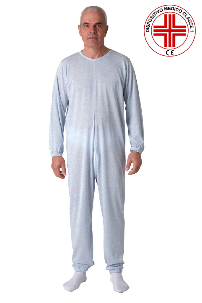 Grazie alla cerniera unica posteriore che si estende fino al punto vita, il pigiama facilita il lavoro degli operatori sanitari durante il cambio degli ausili e impedisce al paziente di rimuovere accidentalmente il capo.