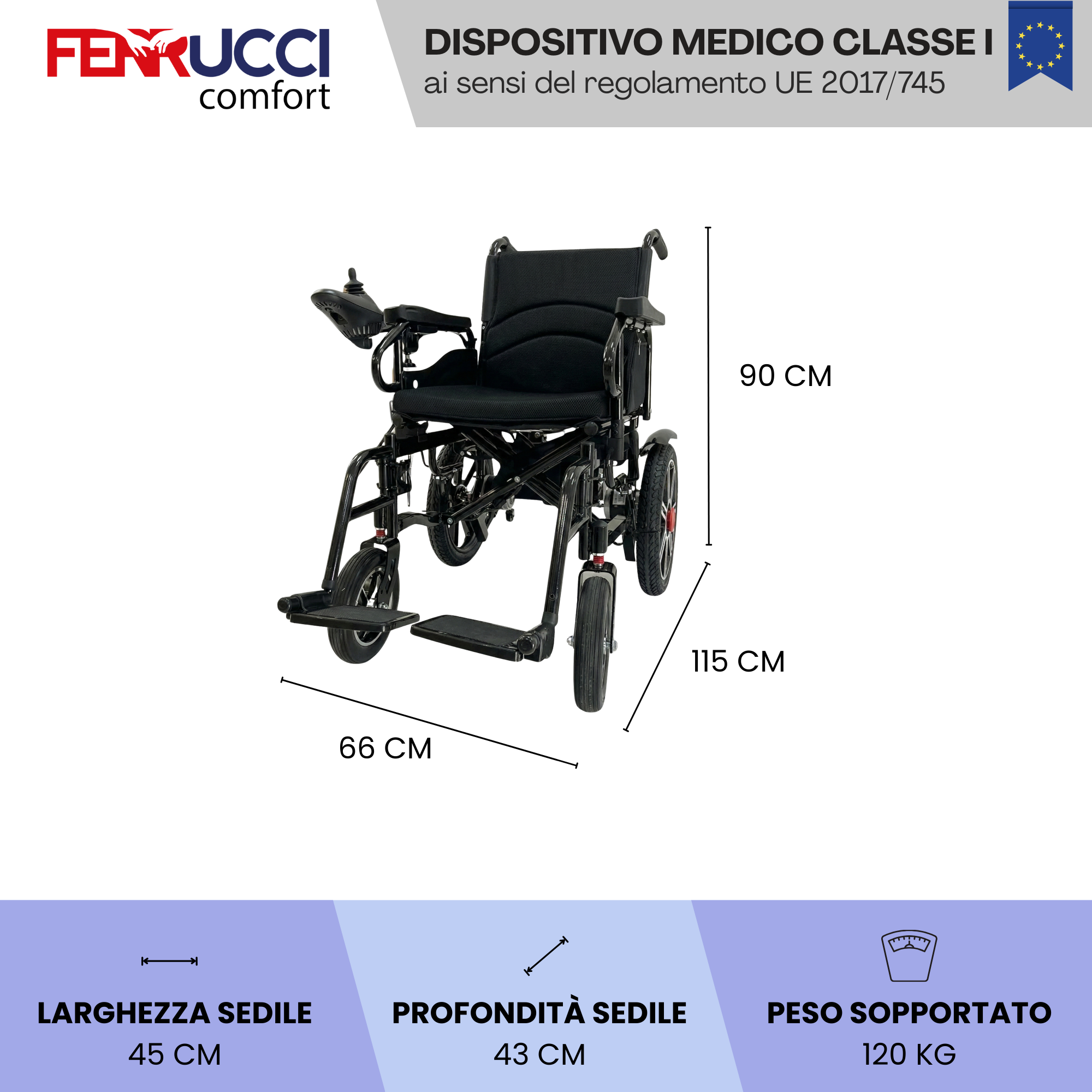 Riconquista la tua libertà di movimento con la nostra Sedia a Rotelle Elettrica Pieghevole di ultima generazione, colore nero elegante. Progettata per offrire massima autonomia e comfort, è la soluzione definitiva sia per gli spostamenti quotidiani in casa che per le avventure all'esterno, grazie alle sue ruote robuste perfette per affrontare terreni sconnessi e sterrati. Controllala facilmente tramite il pratico telecomando o il joystick sul bracciolo.