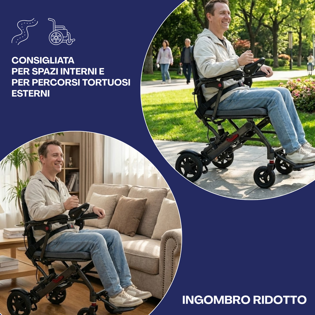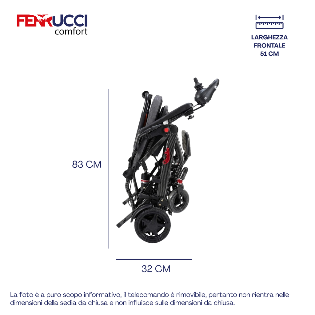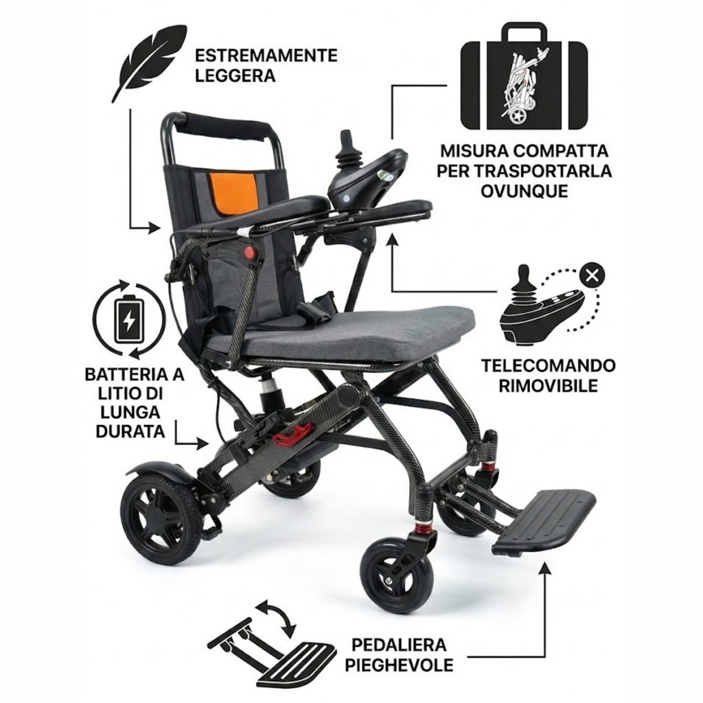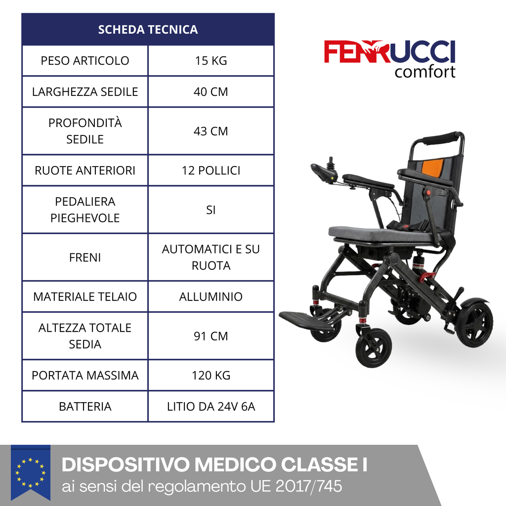 Scopri la carrozzina elettrica pieghevole e da viaggio di Ferrucci Comfort, che ridefinisce il concetto di mobilità personale. Progettata con un focus estremo sulla leggerezza e sulla portabilità, questa carrozzina ti offre l'indipendenza di cui hai bisogno senza compromessi. Perfetta per la casa, i viaggi in aereo o il trasporto in auto, grazie al suo design pieghevole e al peso piuma. La batteria al litio ne consente il trasporto in molti luoghi pubblici tra cui aereo, traghetto, autobus o altro.