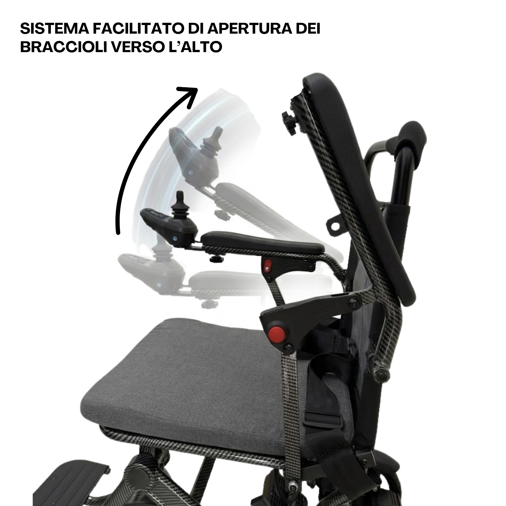 Funzioni speciali: Sedile imbottito, Braccioli reclinabili, Telecomando regolabile, Luce di posizione a LED, Batteria a Litio, Peso ridotto, Ingombro ridotto, Completamente pieghevole, Doppi freni, Pedaliera pieghevole.