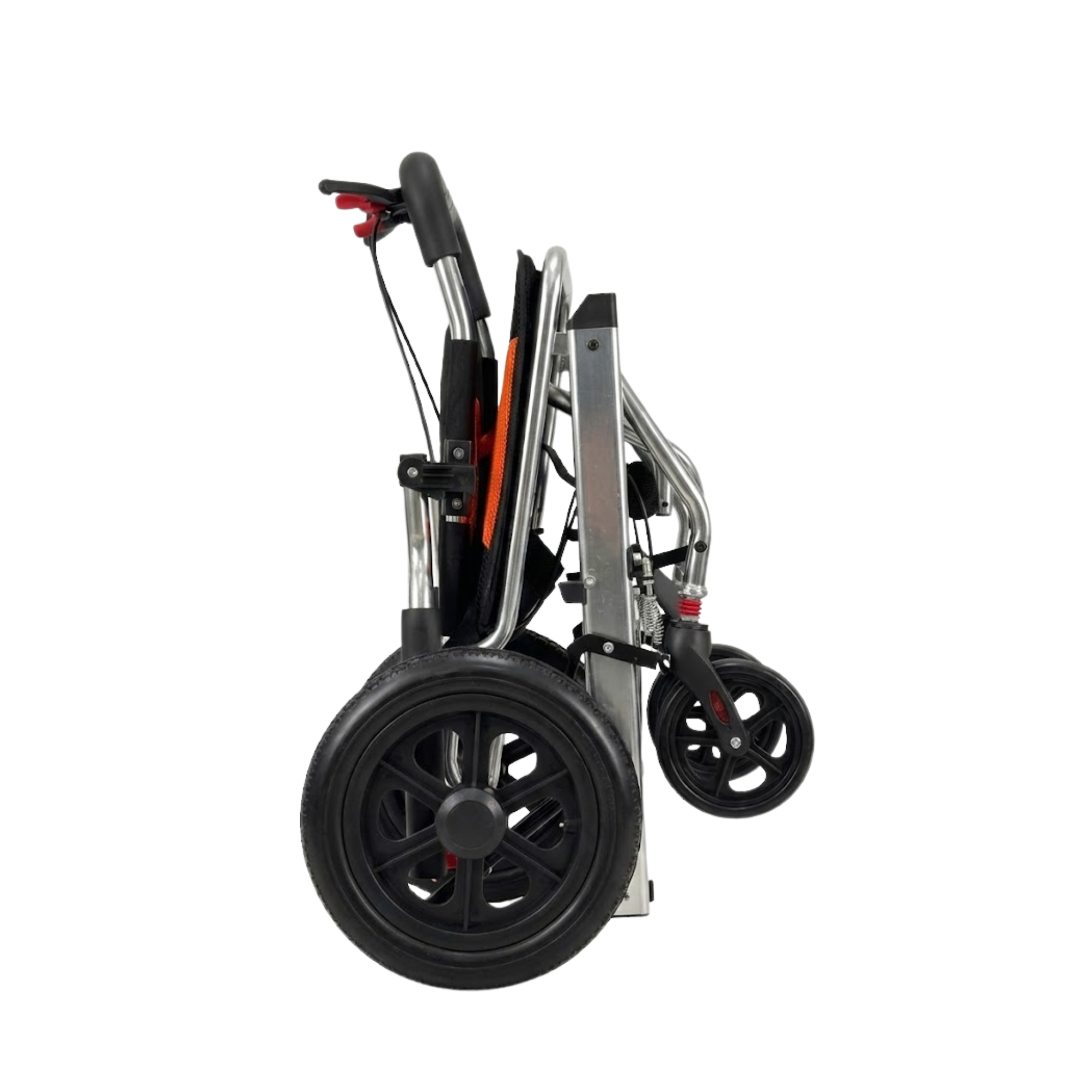 Compattezza estrema: Tutto in questa sedia è pensato per risparmiare spazio. Non solo il telaio si chiude a libro, ma anche i braccioli e la pedaliera sono pieghevoli. In pochi secondi, la sedia diventa piccolissima, pronta per essere riposta ovunque.